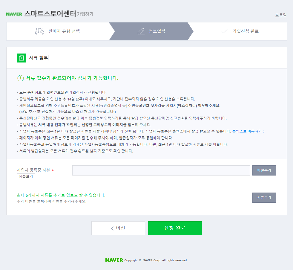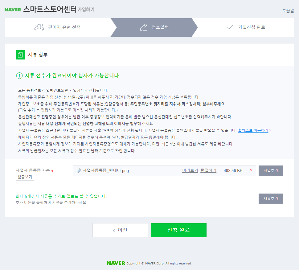 스토어 정보를 모두 입력했다면 마지막 사업자 등록증 사본을 업로드합니다. 개인의 경우는 신분증을 입력하지 않을까 싶네요.ㅎ