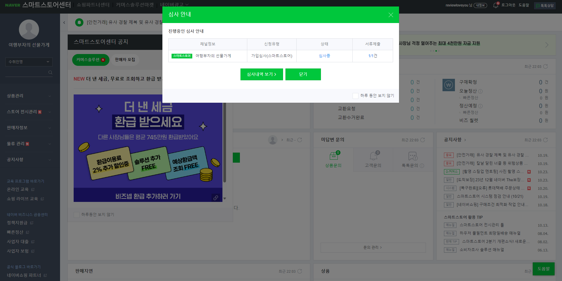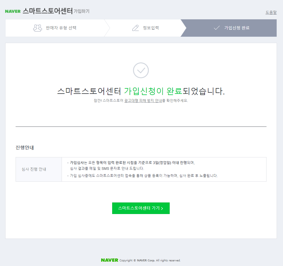 네이버 스마트스토어 개설 절차를 모두 완료하면 심사 중이라고 뜹니다. 저는 개설완료 회신받는데 하루 반나절 정도 걸려네요. 오늘 저녁에 신청해서 모레 오전에 승인 통보를 받았습니다.