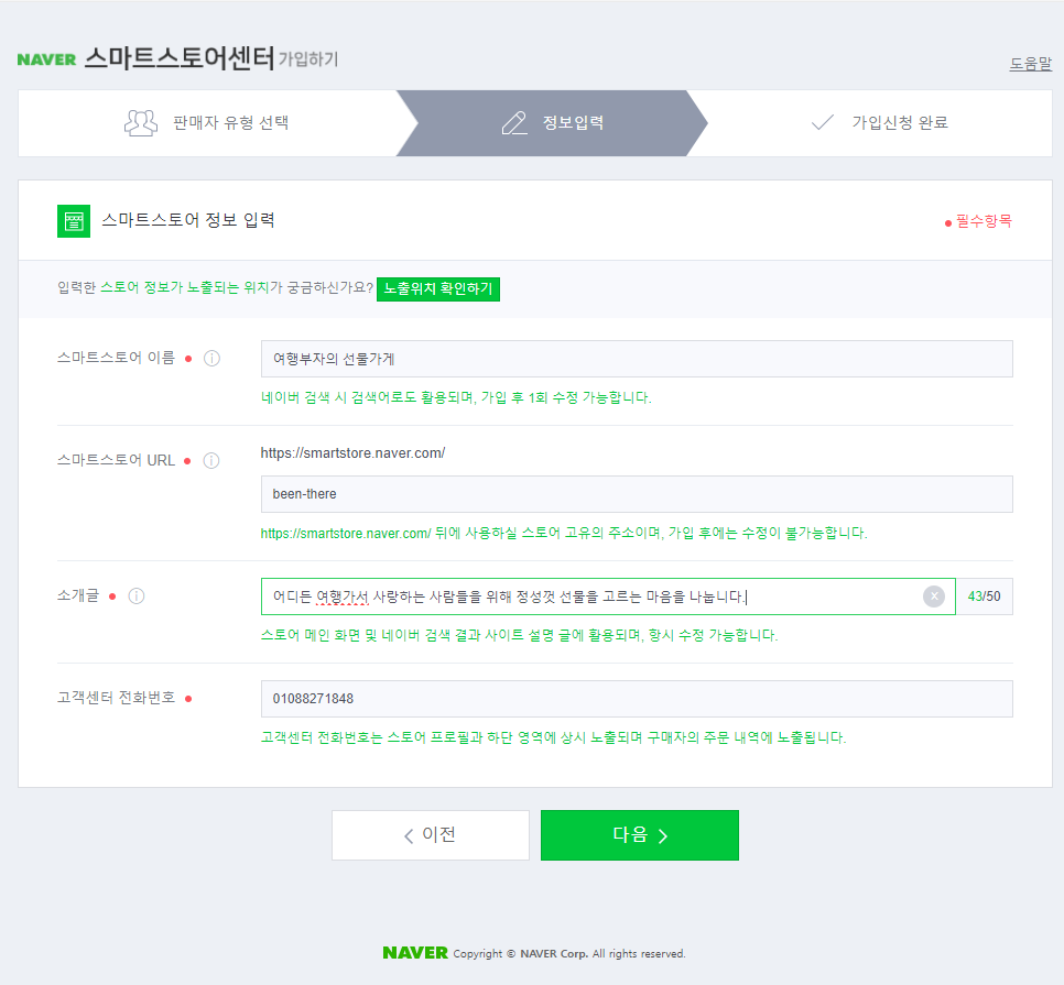 이제 2단계. 스마트스토어 정보 입력입니다. 나만의 스토어를 소개해주세요.