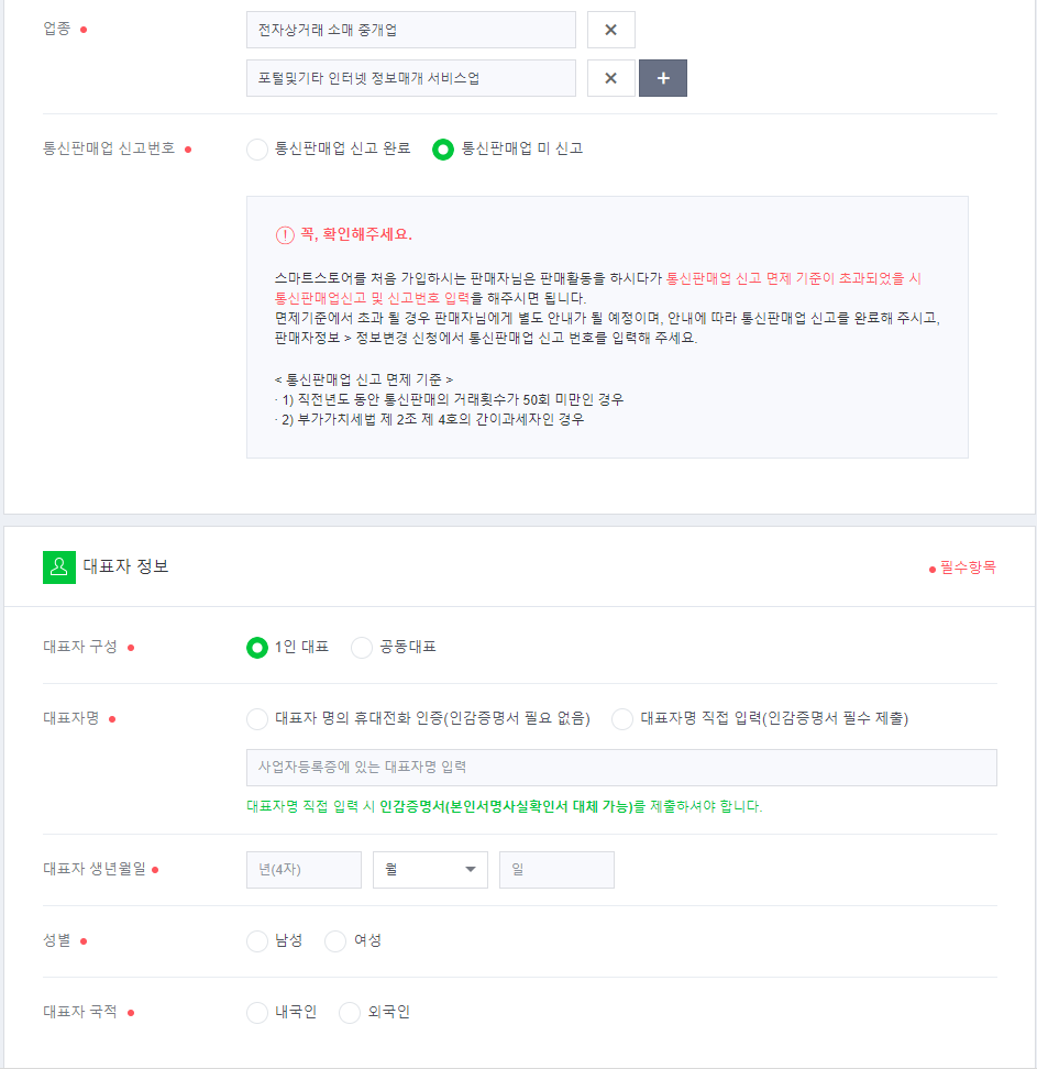사업자등록증의 업태와 종목을 입력합니다. 통신판매업 신고번호를 입력하라고 나오는데, 처음에는 필요 없습니다. 판매가 많았지만 나중에 별도 안내가 온다고 하네요.
